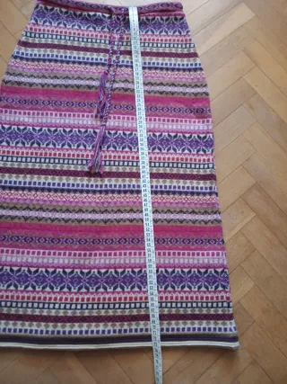 Falda midi de lana con un bonito estampado geométrico y de rombos en tonos rosas y morados. Es una prenda tejida con un diseño muy original. - Diseño de rayas horizontales y motivos. - Cintura con cordón. - Largo midi.