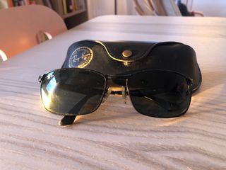Gafas de sol Ray-Ban con montura negra y lentes oscuras. Incluyen su funda original. - Montura metálica. - Lentes con protección UV. - Funda protectora de cuero sintético.