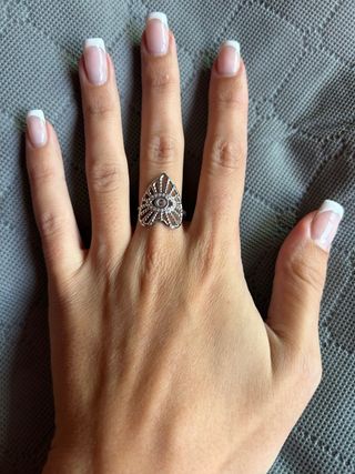 Tal como se ve en las fotos. Conjunto de joyería vintage en Plata y turquesa. Pendientes filigrana. Ranita articulada, etc...El anillo grande mide 18 mms diámetro interior aprox. El pequeño 16 aprox. Al grande le falta una circonita. Todo Vintage, 80 y 90. Usado, cuidado, en buen estado, como se aprecia. Se vende todo junto. Este lote no es negociable.