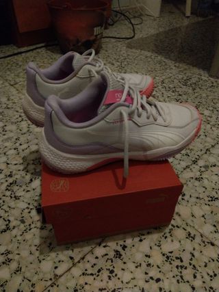 Vendo tenis Puma blancos con detalles en rosa y lila, usados solo 3 veces. - Diseño deportivo. - Cierre con cordones. - Suela de goma.