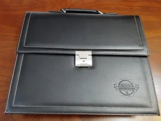 Elegante maletín de cuero sintético, ideal para llevar documentos y un portátil. - Diseño clásico con costuras blancas. - Cierre metálico frontal. - Logo grabado de Educa Business School.