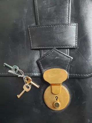 Maletín de piel con costuras visibles, un accesorio con estilo de los años 80. Medidas: 40 x 31 cm - 5 compartimentos, dos con cremallera. - Un bolsillo pequeño - Diseño clásico y elegante. - Material de calidad, cuero vacuno, hecho en Uruguay - Juego de llaves para cierre con hebillas bronce dorado. - Asa superior para un transporte cómodo. - Muy poco uso y en estupendo estado de conservación, sólo algunos pequeños rasguños casi imperceptibles. - Ideal para llevar documentos. Cualquier duda preguntar por el chat.