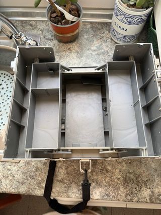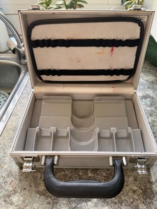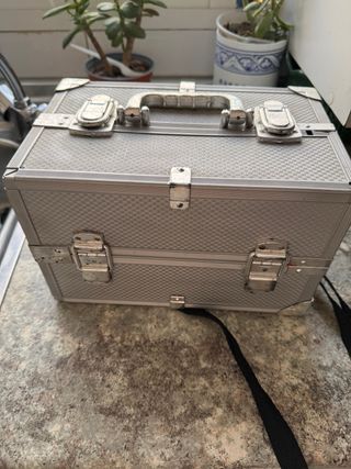 Maletín de maquillaje con acabado plateado y detalles en negro. Ideal para organizar y transportar tus productos de belleza. - Diseño robusto y elegante. - Asa cómoda para el transporte. - Cierres de seguridad.