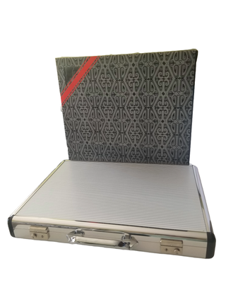 Maletín con un diseño moderno y elegante. 18x13x5 cm Forrado - Acabado exterior en negro. - Bordes y esquinas en plata. - Cierre frontal de seguridad.