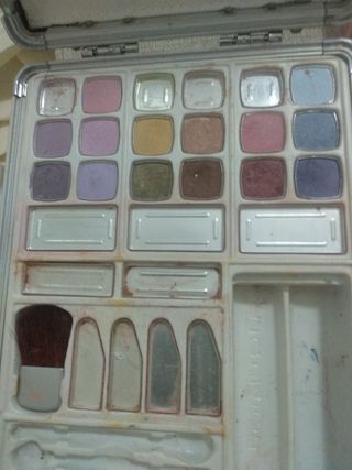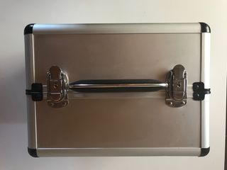 Estupendo maletín para transportar maquillaje y accesorios, o para manualidades. Exterior metálico con dos cierres superiores y asa. Tiene alguna pequeña abolladura y algún arañazo ( ver fotos), por dentro alguna manchita de maquillaje en polvo. Bbdejas de plástico extraibles ( ver fotos). Buen estado general y perfecto para maquilladores o para guardar maquillaje personal o material de manualidades.