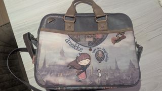 Preciosa bandolera anekke, ideal para llevar tus documentos. Y portátil ya que trae un compartimento acolchado.Se encuentra en muy buen estado. - Asa de mano y bandolera regulable. - Diseño único con ilustraciones. - Cierre de cremallera. Una de ellas le falta el tirador
