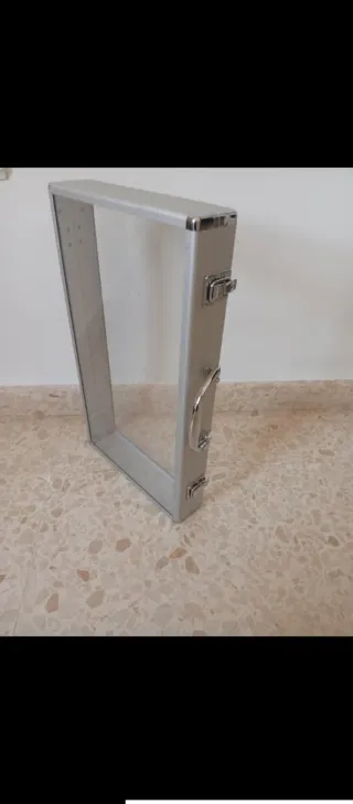 Maletín de aluminio con un diseño transparente y un asa plateada. - Marco de aluminio. - Panel frontal y trasero transparentes. - Asa metálica para transporte.