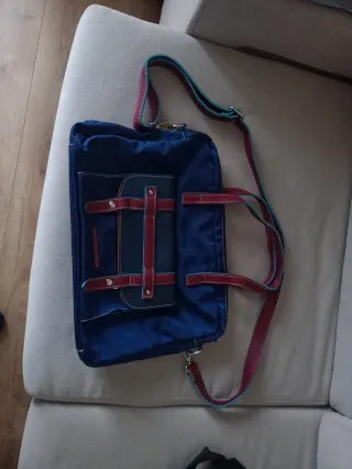 Maletín de la marca Caminatta con un diseño moderno y funcional. - Color principal azul con detalles en rojo. - Correa ajustable para llevar al hombro.