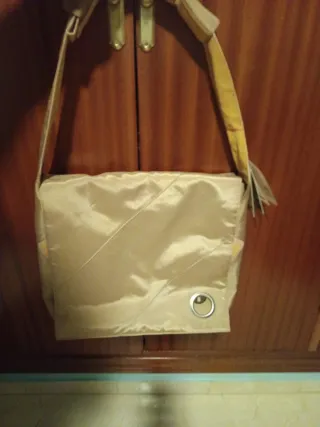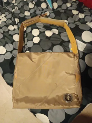 Maletín para ordenador portátil de 15.4 pulgadas. - Color beige y dorado. - Diseño con costuras diagonales. - Incluye un ojal metálico en la parte frontal. - Como se ve en las imágenes cabe un portátil y pueden meterse otros objetos como libros o cuadernos. - Cierre fuerte con velcro. - Como se ve en la imagen es ajustable depende de cómo se quiera colgar. Se encuentra totalmente NUEVO, SIN USAR.