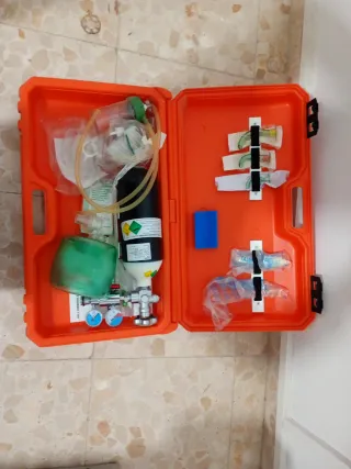 Maletín de primeros auxilios de color naranja. - Asa de transporte. - Cierres de seguridad. - gueduel tres tamaños - abre bocas - pinza sacalengua - sistema aspiración - globo insuflador y mascarilla - bombona oxigeno (hay que sustituirla por caducidad o rellenar) y sistema manometrico - cánulas de aspiracion - manta térmica
