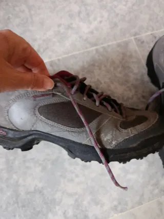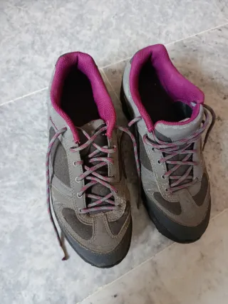 Zapatillas de trekking Decathlon en color gris con detalles en rosa. Perfectas para tus aventuras al aire libre. - Diseño robusto y cómodo. - Cordones resistentes para un ajuste seguro. - Suela antideslizante para mayor tracción.