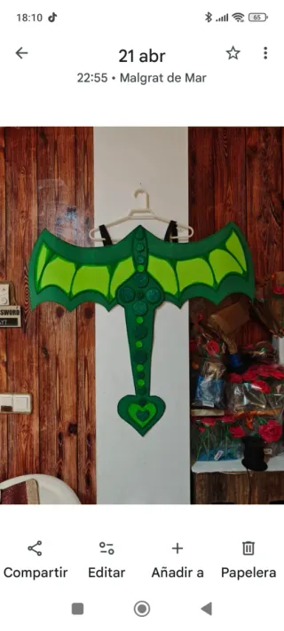 Alas de dragón hechas de goma EVA, perfectas para disfraces y eventos. - Diseño llamativo en verde y multicolor. - Talla única, adaptable.