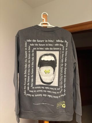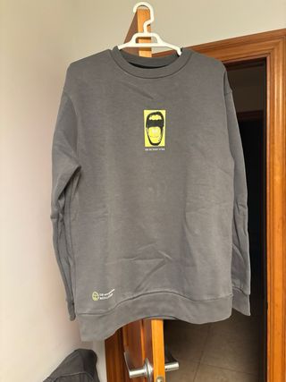 Jersey de vestir de color gris con un diseño gráfico llamativo en la parte delantera. - Estampado frontal con un rostro y texto. - Detalle de logo y texto en la parte inferior izquierda.