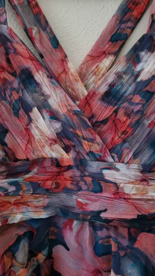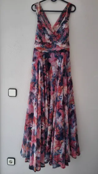 Talla: 40/42 Elegante vestido largo con un estampado floral vibrante. Ideal para ocasiones especiales o para un look de día sofisticado. - Diseño espalda cruzada. - Vestido fluido y con movimiento. - Tejido ligero y vaporoso. Cierre: Cremallera.