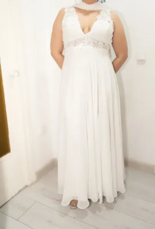 Vendo mi precioso vestido y elegante vestido de novia TALLA XXL con un chal a juego. Lo use solo un a vez y lo lave después de su uso . - Diseño con escote pronunciado y detalles de pedrería. - Falda larga con abertura lateral. - Chal vaporoso que complementa el vestido. No hago envio . También se vende por separado el vestido y chal.