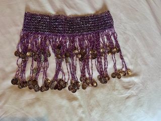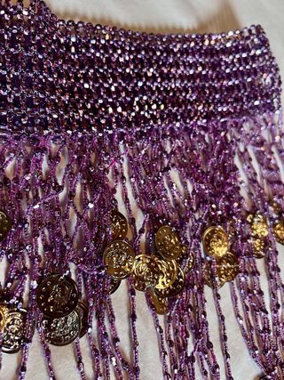 Precioso pañuelo para danza del vientre adornado con cuentas y monedas. - Diseño con flecos y cuentas. - Monedas metálicas que tintinean al moverse.