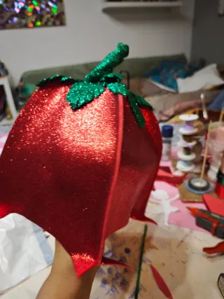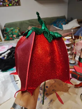 Gorro con acabado brillante, ideal para disfraces de carnaval o fiestas. - Diseño llamativo en color rojo. - Adornado con detalles verdes brillantes en la parte superior.