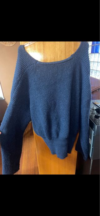 Jersey de punto azul con diseño cruzado. - Tejido suave y cómodo. - Mangas amplias y caídas.