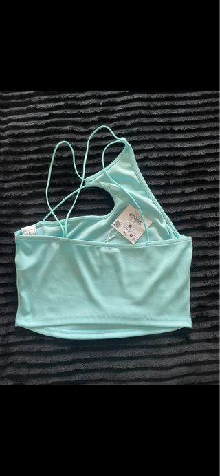 Top de tirantes finos en color azul clarito, con un diseño cruzado en la parte delantera y escote. - Tirantes finos. - Diseño cruzado. - Escote. - Tejido elástico.