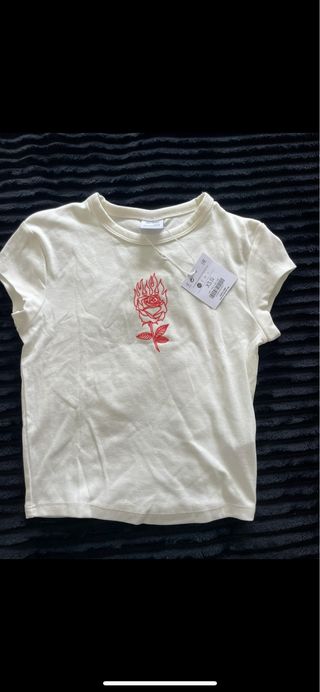 Camiseta beige con rosa en llamas