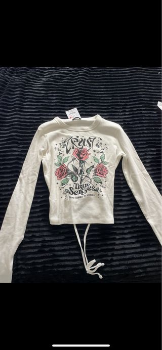 Camiseta de manga larga con un diseño gráfico de rosas y texto. - Parte inferior cruzada con cordón. - Estampado Trust True Senses con rosas.