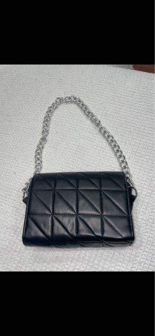 Bolso de mano con un diseño acolchado y elegante. - Acabado en piel sintética negra. - Asa de cadena metálica plateada. - Cierre de solapa.