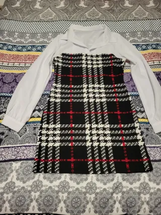 Vestido con estampado de cuadros en blanco y negro, con detalles en rojo. Combina un diseño de camisa blanca con una falda de cuadros. - Diseño tipo camisa. - Estampado de cuadros.