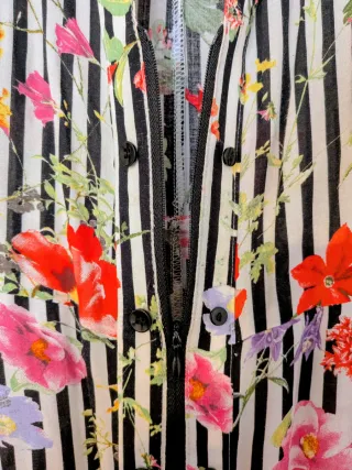 Vestido camisero largo de Zara con un llamativo estampado floral sobre fondo de rayas verticales. Ideal para un look fresco y elegante. - Diseño camisero con botones. - Manga larga. - Largo maxi. Cierre con cremallera modificado en modista. Medidas: Sisa a sisa 50cm Hombros 45cm Caderas 70cm Con bolsillos