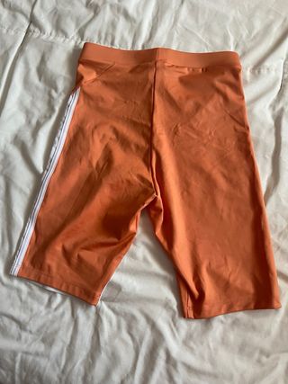 Mallas cortas deportivas con un diseño moderno y llamativo. - Color principal naranja. - Paneles laterales en blanco en una pierna. - Logo de Adidas en blanco. - Tres rayas blancas características de la marca en el lateral