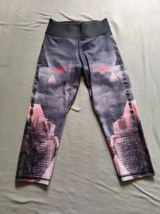 Mallas deportivas Adidas de corte 3/4. - Diseño con estampado geométrico en la parte inferior. - Logo de Adidas en la pierna. - Xs que también sirve para S