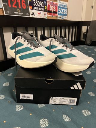 Zapatillas deportivas Adidas Adizero Evo SL. -Talla 43 1/3 -Sin estrenar nunca usadas - Parte superior de malla transpirable. - Mediasuela Lightstrike Pro para una amortiguación reactiva. - Detalles de las tres bandas icónicas de Adidas.