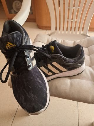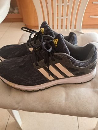 Zapatillas de running Adidas en color negro con detalles blancos. Diseño moderno y ligero. - Parte superior de malla transpirable. - Suela de goma para mayor agarre. - Cierre con cordones. -si usas un 43 también te valen son ajustadas