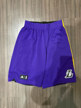 Shorts deportivos de los Lakers. - Diseño de malla transpirable. - Cintura elástica. - Detalle de franja lateral amarilla. - Logos de Adidas y NBA en la parte inferior.