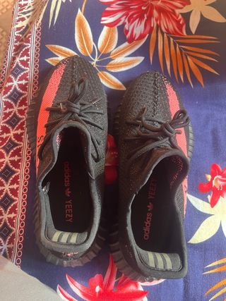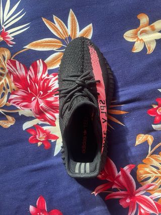 Zapatillas Adidas Yeezy 350 con detalles en rojo. - Diseño de malla transpirable. - Raya lateral distintiva. - Logo de Adidas y Yeezy en la plantilla.