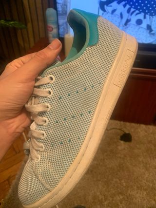 Zapatillas deportivas Adidas Stan Smith con un diseño moderno y fresco. - Parte superior de malla transpirable. - Detalle de color turquesa en el talón. - Suela de goma blanca.