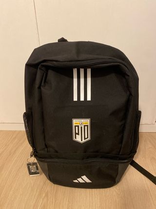 Mochila negra con el escudo del Futbol Club Pio y el logo de Adidas. - Tres rayas blancas distintivas de la marca. - Bolsillo frontal con cremallera. - Bolsillos laterales de malla. - Llavero con el escudo del Pio incluido.