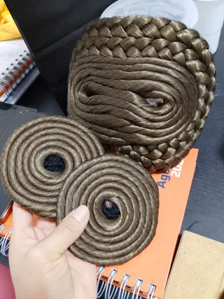 Dos rodetes de fallera, de unos 9 cm de diámetro y una trenza de 3 mallas de unos 75-80cm. Perfecto para completar el peinado tradicional. - Color castaño claro con matices dorados -Puestos 3 días.