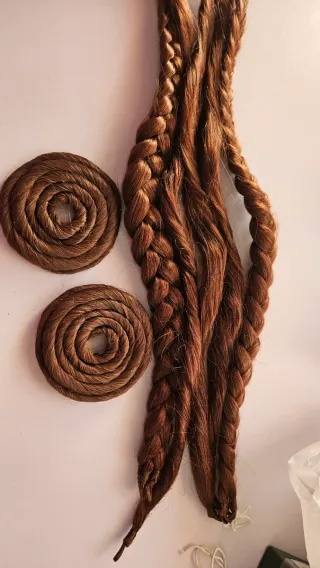 Conjunto de mallas y rodetes para indumentaria fallera. Incluye dos rodetes enrollados y varias mallas trenzadas y retorcidas. En total son9 mallas,de las cuales 6 están usadas para las trenzas y otras 3 retorcidas.de pelo natural y tonalidad rubia. - Rodetes enrollados.