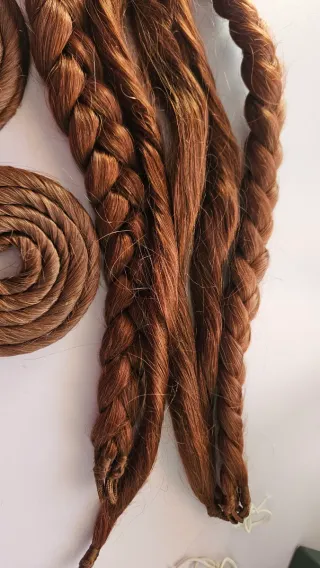 Conjunto de cinco mallas de pelo natural, ideales para trajes de fallera. El tono rojizo aporta un toque vibrante y auténtico. 45cm - Material: Pelo natural. - Cantidad: 5 mallas.