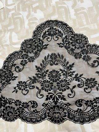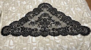 Mantilla negra para niña de fallera Modelo 3 picos Medidas 130cm lago 65cm ancho - Diseño con motivos florales. - Borde festoneado. - Tejido de malla fina.