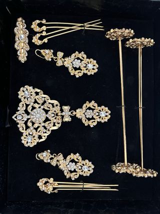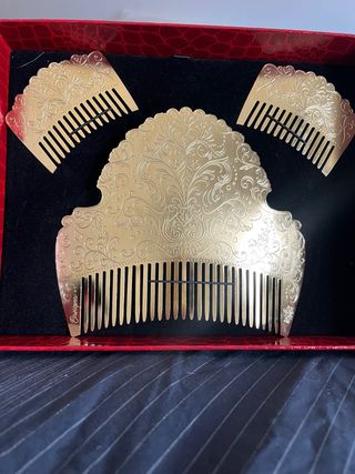 Esta todo nuevo, sin usar nunca y con sus cajas originales. Preguntar por precios!! •Peinetas oro: Alan Indumentaria •Aderezo oro: Alan Indumentaria •Manteletas lentejuela oro: Alan Indumentaria •Mantilla marfil: Alan Indumentaria •Rodetes y 6 mallas pelo natural castaño: Realce