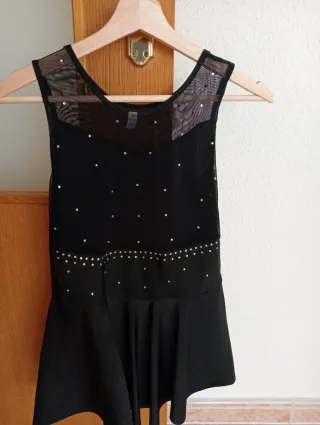 Malla de gimnasia con un diseño elegante y detalles brillantes. Utilizado una vez. - Cuerpo superior de malla transparente. - Adornada con pedrería plateada. - Falda integrada con vuelo.