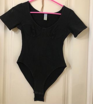 Body de malla con mangas cortas y escote.redondo con pequeño adorno.ideal para gimnasia ,ajustable.Medidas ancho de pecho 37 ctms ,largo hasta el cierre con corchetes 67 ctms - Diseño con corte bajo el pecho - Tejido elástico.