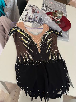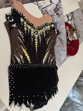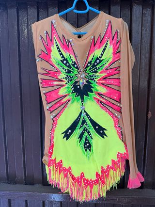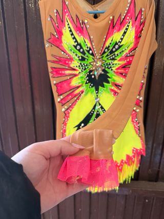 Maillot de gimnasia rítmica con un diseño llamativo. Solo se ha usado 3 veces. - Sin mangas. - Detalles en malla. - Falda con flecos.