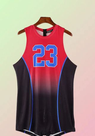 Mallas de gimnasio con un diseño deportivo y llamativo. - Combinación de colores rojo y negro. - Detalle del número 23 en la parte frontal.