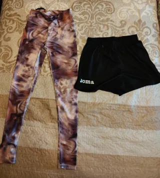 Conjunto de mallas deportivas y pantalón corto. - Mallas deportivas con estampado abstracto, muy bonitas. Tienen un pequeño bolsillo para guardar la llave de la taquilla de un gimnasio, por ejemplo - Pantalón corto deportivo negro con logo Joma