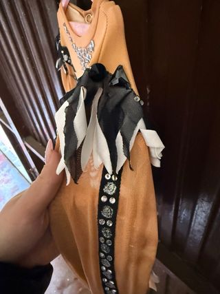 Malla de competición con un diseño vibrante y detallado, perfecta para destacar en el tapiz. - Diseño inspirado en plumas y alas. - Adornada con pedrería brillante. - Base en tono dorado. - Falda con corte irregular y festoneado.