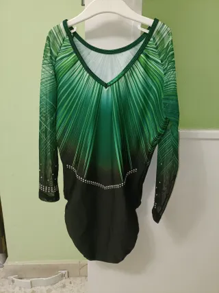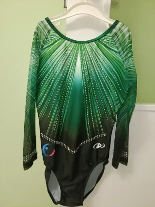 Maillot de gimnasia de manga larga con un diseño vibrante en degradado de verde y negro. Presenta detalles brillantes y un corte elegante. - Mangas largas de malla transparente con detalles brillantes. - Diseño frontal con efecto rayos de luz y pedrería. - Cuello redondo. - Logos en la parte frontal inferior.
