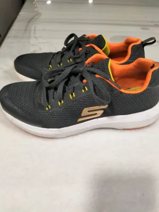 Zapatillas deportivas Skechers en tonos grises y naranjas. - Diseño de malla transpirable. - Detalle de logo 'S' en el lateral. - Cordones grises. - Forro interior naranja y amarillo. - Con un poco de desgaste en el talón