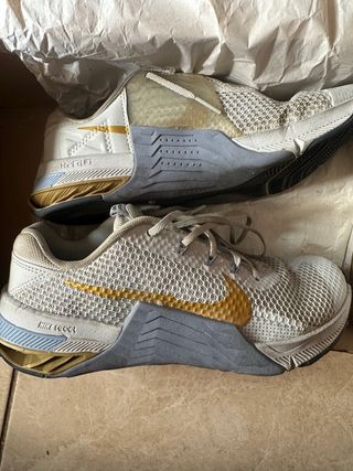 Zapatillas deportivas Nike Metcon en color blanco y dorado. Diseñadas para entrenamiento. USADO TAN SOLO UNOS DÍAS. - Parte superior de malla transpirable. - Detalle de Swoosh dorado. - Suela de goma para mayor tracción. Precio: 110€ ✅ NEGOCIABLE ✅ Talla: 39 👟 ‼️ GENTE SERÍA ‼️